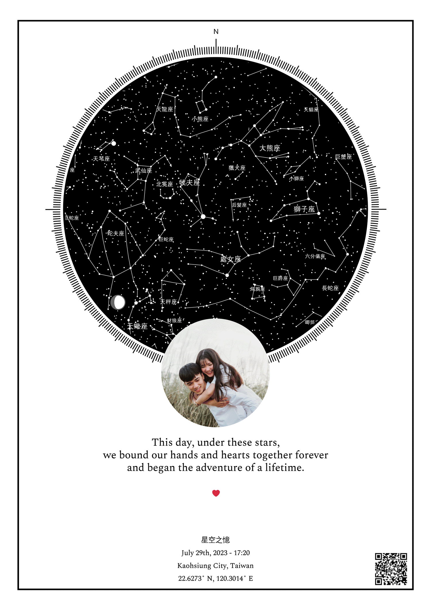 自己設計並選擇各種顏色、形狀、星星、星座、月亮、銀河、邊框、經緯度等等